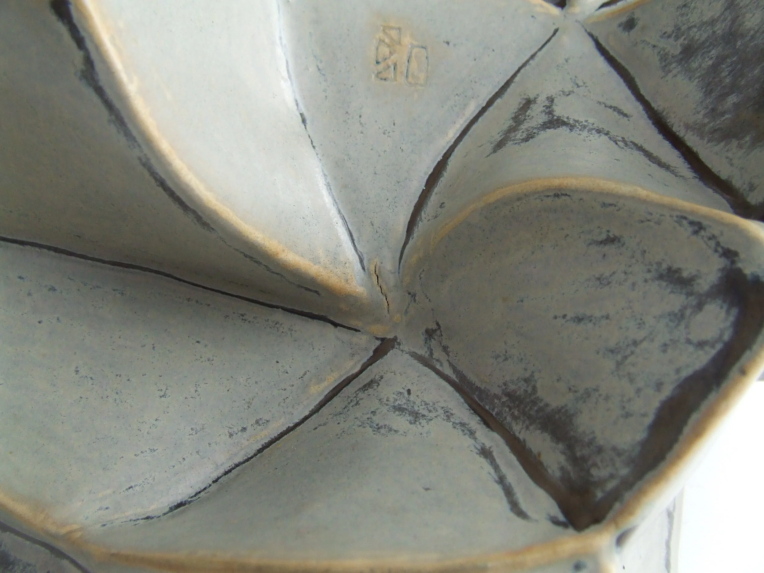 Gray matte with dark blue highlights. Please note: There is a tiny surface crack on the bottom of the bowl (visible in the middle of the last picture) and another similar one on the inside. Porcelain.