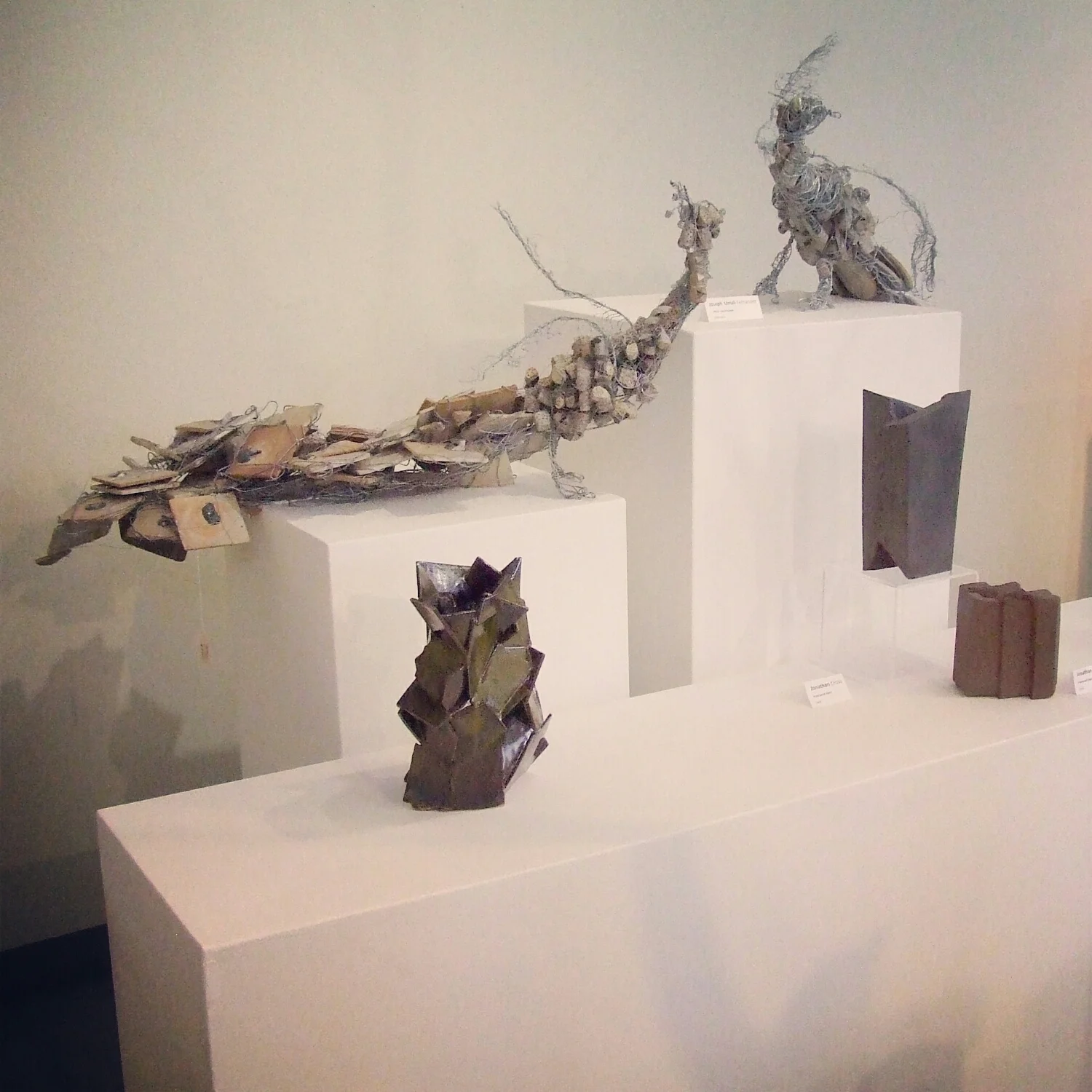 I am supremely flattered to have four pieces on display in the Gallery at the Xiem Clay Center, including the Haphazard Teadust Vase below. Next to it are two vases by Jonathan Cross whom I met in October at the kazegama firing at Aardvark Clay. I admire his vases' brutalist look and his approach to finding native clay. Overlooking our works are two pieces by Joseph Umali Fernandez. I adore multimedia pieces that explore ceramics' characteristics and contrast them with other materials, and these are gorgeous. Very proud to be in their vicinity.